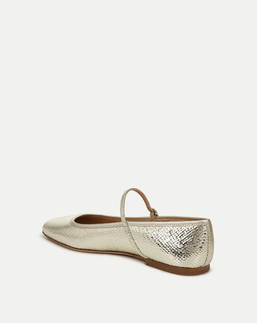Made from metallic snake-embossed leather, this timeless silhouette is finished with a demure strap at the vamp. They’re an effortlessly chic pairing with your favorite jeans.